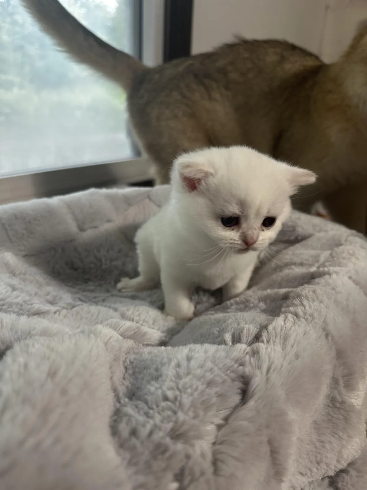 Snow is our distinguished Scottish Straight stud, celebrated for his pristine white coat and captivating blue eyes. Confident yet affectionate, Snow brings both strength and gentleness to our breeding program. His excellent health, balanced temperament, and striking features make him an ideal sire, producing kittens that are not only beautiful but also full of charm and companionship.